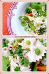 Egoutter les pâtes aux petits pois, les mettre dans un grand saladier. Rajouter la ciboulette, le persil et la roquette, mélanger.