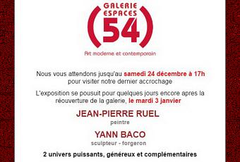 Galerie ESPACES 54  Jean-Pierre RUEL et Yann BACO  jusqu’au 24 Décembre 2016Galerie ESPACES 54  Jean-Pierre RUEL et Yann BACO  jusqu’au 24 Décembre 2016Galerie ESPACES 54  Jean-Pierre RUEL et Yann BACO  jusqu’au 24 Décembre 2016Galerie ESPACES 54  Jean-Pierre RUEL et Yann BACO  jusqu’au 24 Décembre 2016