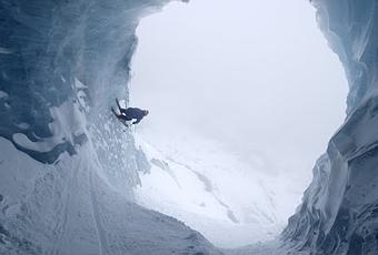Sam Favret fait du ski dans le paysage escarpé de la Mer de Glace à côté de Chamonix. Il se faufile entre des blocs de glace et dans les ravins et les grottes qui parsèment la surface du glacier.