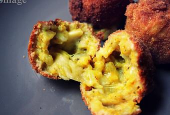 Coupez votre oignon en petits morceaux et la mozza en cube assez gros. Dans un saladier, placez la purée, l'oignon frais, le poivre, et un œuf. Remuez bien. Farinez légèrement vos mains et formez vos boulettes, en écrasant d'abord la purée en forme de pancake dans le creux de votre main puis en plaçant un morceau de fromage au centre avant de refermer la boulette autour du fromage. Dans trois bols séparés, placez la farine, la chapelure et l'œuf restant (battu). Passez vos boulettes dans la farine, puis dans l'œuf et enfin dans la chapelure. Ajoutez une nouvelle couche d'œuf et de chapelure. Mettez de côté et placez au frais en attendant de les faire frire. Versez de l'huile dans une poêle et faites frire les boulettes jusqu'à ce qu'elle soit dorées de tous les côtés. Placez-les sur de l'essuie-tout pour absorber l'huile. Une fois que toutes vos boulettes sont frites, placez-les dans un plat à four, salez et enfournez pendant 5 minutes à 200˚C. Dégustez !