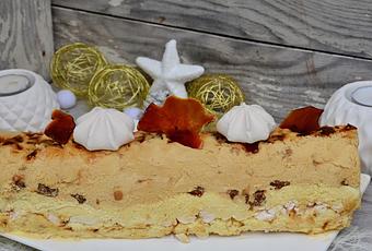Avant de servir, démouler la bûche et décorer au dernier moment avec des meringues et des morceaux de caramels.