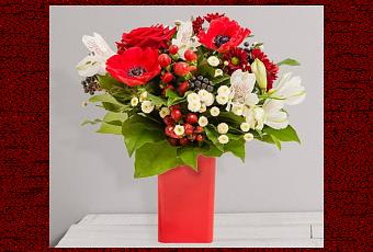 La rose rouge et l’anémone se mettent aux couleurs de Noël et rivalisent de beauté dans ce bouquet rond de saison aux tons rouges et blancs. Une création festive et très décorative qui promet de créer une heureuse surprise durant les fêtes de fin d’année.