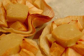 Dans une corolle de pâte à dumpling reposent des morceaux de pommes (ou de poires) et du "chèvre" de VegNature nature. Comme il fait froid  ;-)  ... les tartelettes se réchauffent au four, à 400, pendant une vingtaine de minutes.