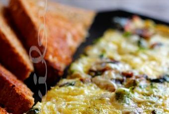 3)Dans une poêle antiadhésive allant au four, chauffer l'huile d'olive à feu moyen-doux. Ajouter l'oignon et cuire environ 2 minutes. Incorporer l'ail, les champignons et le brocoli, poursuivre la cuisson 5 minutes. Ajouter les épinards, cuire 1 minute. Saler et poivrer.