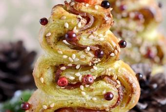 - Coupez des lanières de pâtes d'environ 2 cm de large sur toute la longueur puis façonnez vos sapins sur un pique en bois en repliant la bande sur elle-même. Posez-les sur une plaque à pâtisserie puis à l'aide d'un pinceau, badigeonnez un peu de jaune d'œuf sur le dessus et sur la tranche. Saupoudrez de graines de sésame et déposez quelques baies roses.