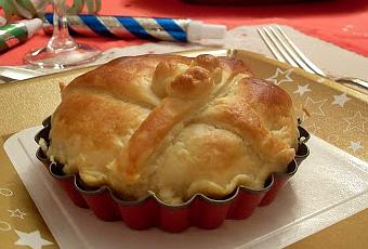 Ourler et souder les bords. Former des petites cheminées au centre. Badigeonner de crème d'avoine et décorer selon vos envies.