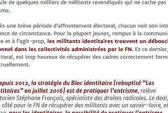 « Et la nièce de Marine Le Pen, quant à elle, a salarié au conseil régional de PACA Damien Rieu – un pseudo –, chef de file de Génération identitaire (la branche « jeunes » du Bloc identitaire) et contributeur du site de la fachosphère « Fdesouche ». Le jeune homme a aussi cofondé la société de communication Janus, prestataire de la députée. »