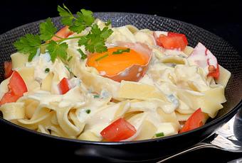 Les vacances sont déjà derrière nous et la reprise dans un froid aussi glacial n'est pas des plus faciles. Si j'avais une baguette magique, je les aurais prolongées d'une semaine encore, en attendant un climat plus doux. Enfin...Alors, si vous rentrez tard et/ou si vous avez peu de temps à consacrer à la cuisine, je vous propose, aujourd'hui, un plat prêt en quelques minutes et délicieux si vous aimez les fromages de caractère : des tagliatelles au Bresse bleu."L'histoire de Bresse bleu est étroitement liée à l'immigration italienne en région lyonnaise. Lorsque le gorgonzola de l'Italie de Mussolini cessa d’arriver en France, plusieurs laiteries bressannes, à l'initiative de fromagers italiens qui avaient passé la frontière, entreprirent de combler ce manque. Il créèrent ainsi le "saingorlon",un fromage à pâte persillée s'inspirant de la recette du gorgonzola. Après rachats et regroupements de laiteries, ce fromage donna naissance au début des années 50 au Bleu de Bresse, dénomination devenue aujourd'hui générique, puis en 1952 à Bresse bleu, marque de qualité. Fabriqué au lait de vache entier, Bresse bleu partage avec son cousin italien la même texture crémeuse et le même bleu marbré."(Suite sur le Bresse bleu)Dans la recette initiale, la crème est à base de lardons, Bresse bleu et crème. J'ai zappé les lardons pour une version végétarienne et une version plus "light". A la place, j'ai ajouté une tomate crue.Les oeufs doivent être frais et le plat consommé de suite.Bien sûr, on peut opter pour d'autres pâtes comme des spaghetti par exemple.