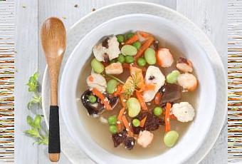 - Crevettes aux petits légumes et son bouillon au Miso.