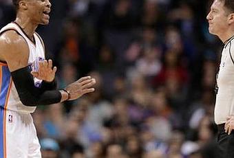 Mais lorsque ce ne sont pas de ses actions d’éclat sur le terrain, c’est de ses petites phrases et de son comportement qui font parler de « Westbeast ». Ainsi, cette nuit, « Russ » a compilé 33 points, 15 rebonds et 8 passes décisives mais il a surtout envoyé la balle à la tête de l’arbitre lors d’un temps mort du premier quart temps. Alors qu’il rejoignait le banc, Westbrook a envoyé la balle en direction d’un arbitre, qui ne regardant pas, l’a reçu en pleine tête. Si le meneur d’OKC a tout de suite expliqué qu’il n’avait pas fait exprès, il a écopé d’une faute technique. Il faut croire que celui-ci a été persuasif car un tel geste aurait pu valoir une expulsion. Cela aurait fait la deuxième en une semaine!