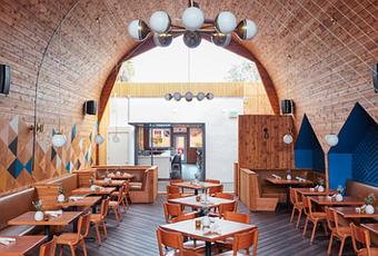 La zone de restauration est définie par un plafond voûté de 6 mètres de haut et bardé de cèdre. Pour apporter des signaux et définir les espaces, les designers ont placé des panneaux triangulaires et multicolores le long d’un mur et des alcôves aux bas-reliefs bleus et géométriques de l’autre côté.