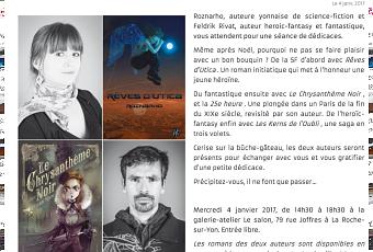 Un article sympa dans La Roche&Elles pour annoncer notre dédicace avec Feldrik Rivat au Salon, atelier-galerie de Véronique LG Morin, situé 79 rue Joffre, à La Roche-sur-Yon (85).