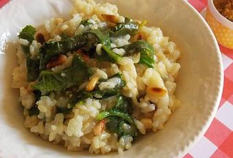 Pour mon Risotto, j'ai opté pour du chou Daubenton (un chou perpétuel qui ne gèle pas). Je l'ai agrémenté également d'un peu de pignons de pin pour leur goût et pour apporter du croquant.
