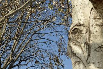 Un arbre placide. Rien d'érotique dans ce tronc pâle, épais, un tronc rassurant dans lequel joue la lumière. Les feuilles dorées de l'arbre voisin semblent le caresser. Frôlement ténu, timide, sur le puissant voisin.