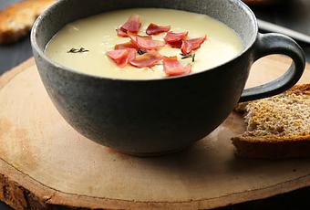 Alors je reconnais que j'ai plus envie de soupes réconfortantes que de salades légères et cette recette dans un magazine anglais tombait à pic : " une soupe tartiflette" , le rêve , en plus j'avais un petit reblochon dans mon congélateur .