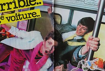 Le look ! Pour Elle, over-maquillage et pommettes saillantes, brushing, rose fluo, veste blanche, pantalons à pinces... Pour Lui, costume de yuppie, cette cravate jaune improbable et le pin's (badge). Toute la dynamqiue new-wave des années 80 captée par la RATP dans cette page de pub prise dans cnac magazine (circa 1980).