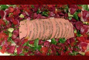 Escaloper le foie gras de canard mi-cuit et le disposer au centre du plat, parsemer de ciboulette hachée.