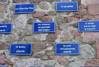 Dans l’exposition Le territoire à l’oeuvre, présentée hier dans ce blog, il y a le mur sur lequel Sarkis a installé des plaques de rues (autant que de rues existant à Sélestat au moment de la réalisation, plus quelques plaques vierges) où il a fait inscrire des phrases, des mots, citations empruntées à plusieurs auteurs. Cette oeuvre est intitulée Le rêve. En faisant quelques recherches sur Internet, j’ai trouvé un site de géocaching proposant une photo d’une partie de ce mur. Le géocaching est une sorte de course au trésor utilisant le géopositionnement par satellite. La photo jointe à cet article vous donne quelques groupes de mots. Je vous propose d’en retenir trois ou quatre et de les relier en ajoutant entre eux une phrase après chaque groupe sélectionné (à l’exception du dernier), soit :