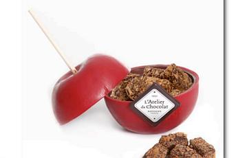 Pour fêter la Saint Valentin, L’atelier du chocolat propose une Pomme d’Amour . La coque est toute en chocolat au lait 100% pur beurre de cacao et habillée d’un rouge éclatant. A l’intérieur une surprise : les fameux Feuillants d’Or.