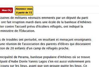 A force de scruter les fils d’actualités pour nourrir ce blog, on sait désormais que les bas du front infectés par la peste brune ne répugnent à aucune outrance, aucune contradiction, aucune malhonnêteté, aucun délit. Mais de là à s’en prendre à nos chères têtes blondes ou brunes, fussent-elles grecques, voilà qui marque un tournant dans l’audace idéologique répugnante de ces outres à vomi emplies de haine et de violence, comme le démontre cette information :