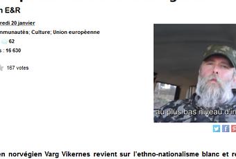 Si vous ne le connaissez pas, vous ne perdez vraiment rien tant tout en lui dispense de le connaitre : ce « musicien » de black métal identitaire, ouvertement raciste est un adepte du néo-nazisme qui a été condamné pour plusieurs incendies criminels visant des églises (c’est également un adepte du paganisme) et condamné pour le meurtre en 1993 de Øystein Aarseth, membre du groupe Mayhem. Il a également été suspecté en fRance (son épouse est française) d’être un admirateur d’ Anders Behring Breivik et de préparer un attentat. Une enquête préliminaire à sa charge avait été ouverte au préalable par la section antiterroriste à la suite de l’achat d’armes par sa femme. Une perquisition menée le 16 juillet 2013 a débouché sur la saisie de cinq fusils et carabines dont quatre de calibre 22 long rifle (source). Et donc, muni de ce sinistre pedigree, ce bas du front raciste et violent, au casier judiciaire déjà bien chargé, s’exprime en ces termes sur le site de Soral (E&R), du même tonneau de merde raciste nazie :