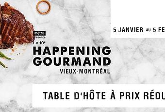 Organisé par le Groupe Antonopoulos, le Happening Gourmand se déroule du 5 janvier au 5 février 2017. Pour l’occasion, 9 restaurants ayant pignon sur rue dans le Vieux-Montréal offrent des tables d’hôte très alléchantes à prix d’ami. Parmi ces restaurants, on retrouve la Suite701, le Bevo Bar + Pizzeria, le Modavie et le Maggie Oakes. Afin de souligner la 10e édition de cet événement culinaire, les restaurants participants au Happening Gourmand remettront 1$ par table d’hôte servie à l’association Dans La Rue qui vient en aide aux jeunes sans-abris.