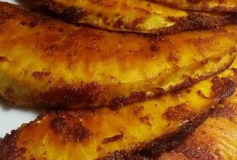 J’ai fait une recette assez simple. J’ai coupé la chair en tranches et je l’ai ai épicées et puis je les ai passées à la poêle. Il faut faire attention en travaillant le fruit de l’arbre à pain – après l’avoir coupé, il faut mettre les morceaux immédiatement dans un saladier d’eau avec un filet de jus de citron ou vinaigre pour éviter la décoloration due à l’oxydation.