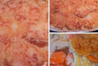 4- Dans un plat à gratin allant au four mettre une couche de pomme de terre puis une couche de carotte puis une couche de poulet.