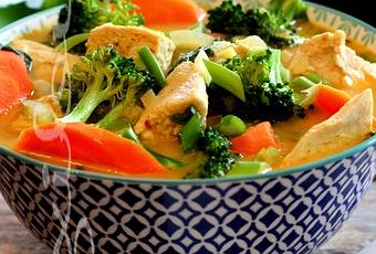 Mmmm!! J'ai créée une soupe-repas à mon image hihihi! Bondée de légumes encore bien croquants avec de bons morceaux de poulet baignent tout doucement dans un bouillon à base de lait de coco épicé au cari, gingembre, citronnelle, beurre d'arachides, curcuma et coriandre ça vous parle? Oui oui, autant d'ingrédients exquis pour alimenter le charme de cette soupe aux saveurs d'Orient ;)
