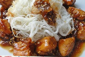 Observation : Par la contrainte, j'ai dû changé un peu les doses de la sauce ... et bien cette sauce caramélisée est une superbe réussite !!! Le poulet bien tendre, bien parfumé et caramélisé avec en prime les petits morceaux d'oignons eux aussi enveloppés de sauce caramélisée, le tout présenté avec le vermicelle de riz .... oh là là, quel régal !!!!!!!