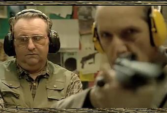 A man travels to a rifle in a shooting gallery, but it is obviously at the stage of apprentice shooter... An advertisement for food supplements of the German pharmaceutical company Doppelherz.