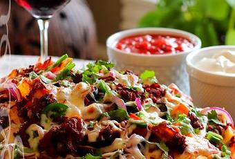 6)Les garnir du mélange de porc, puis du fromage, et enfin des tomates, des oignons, des olives noires et du piment. Passer les nachos sous le gril jusqu’à ce que le fromage soit fondu.