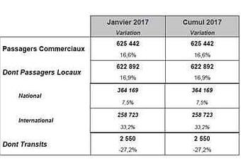Une hausse consécutive à l'augmentation de l'offre à l'international sur le programme Automne-Hiver 2016-2017. Le trafic international est en hausse de 33,2 %, le national de 7,5 %. Le secteur low cost représente 36,6 % du trafic, en progression de 58,4 % par rapport à janvier 2016.