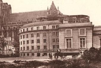 Les deux cartes d'époque montrent, l'une, la bibliothèque côté sud avec la cathédrale dont la toiture est en cours de reconstruction, l'autre, l'arrière de la bibliothèque vue de la rue du cardinal de Lorraine.