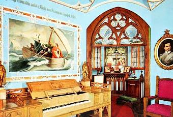 A remarquer le beau piano carré, aussi appelé piano de Wagner. Dans cette pièce, Richard Wagner interpréta de ses oeuvres pour le Roi Louis II de Bavière, dont on voit un portrait à droite de l'entrée de la chapelle. La décoration de la chapelle remonte à l'époque de Louis II. Deux icônes précieuses décorant l'autel, un présent du Tsar Alexandre II. Le crucifix est en lapis-lazuli, le Christ est l'oeuvre du sculpteur danois Thorvaldsen.