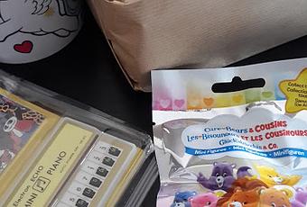 -Parce que j'ai grave craqué en choisissant une tasse My Little Poney made in 1983 (année de ma naissance), un mini piano Electron Echo (j'en avais un quand j'étais petite!), une valisette so cute remplie de bonbons génialissimes de ma jeunesse et enfin un petit sachet Bisounours pour la petite surprise.