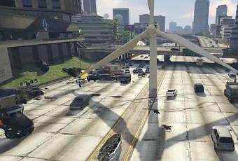 Une éolienne placée au milieu d'une autoroute du jeu GTA V, et c'est un véritable chaos !