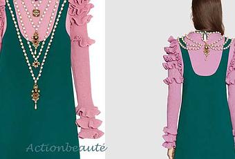 Cette mini robe est l'une de nos looks préférés du défilé automne 2016 de Gucci. Composée d'un somptueux mélange de laine, cette robe rose et verte est ornée de faux perles et de cristaux pour ressembler à des couches de colliers.