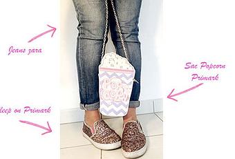 Aujourd’hui j’ai associé un jeans de chez Zara que j’ai retroussé pour avoir une version 7/8 encore très à la mode cette année, avec une paire de sleep on rose pailletée que j’ai acheté trois fois rien chez Primark et qui sont mega hyper confortable (aussi confortable que des chaussons!). Et enfin j’ai ressorti mon sac Popcorn, pas très pratique car on ne peut pas y mettre grand chose mais très mignon et que j’ai aussi acheté chez Primark pour une bouchée de pain !