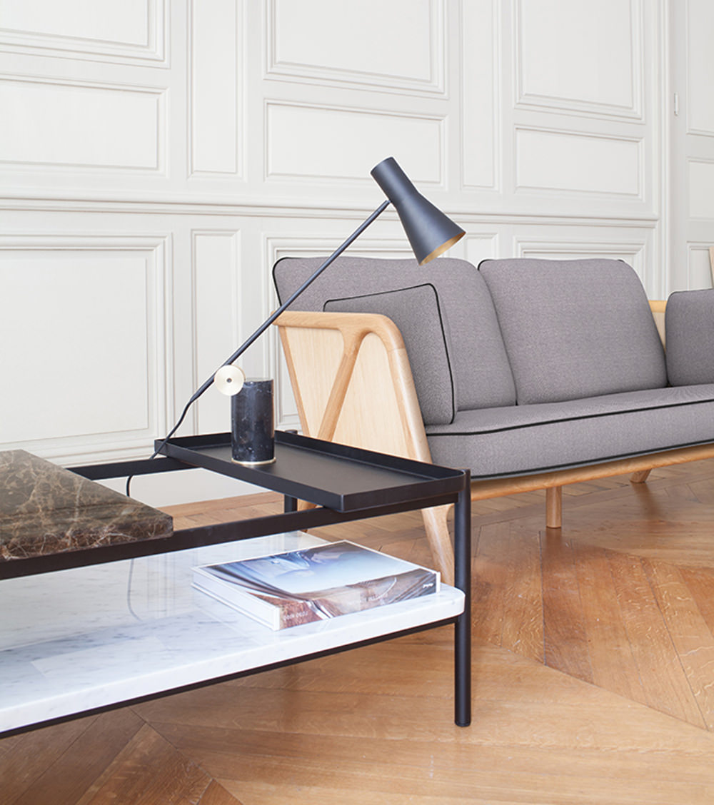 Le résultat est bien le même, un canapé original, véritable invitation à la détente. Le duo de designers joue avec les formes et lignes, mettant en avant le piètement tel une structure apparente sur les accoudoirs de l’assise. Chaque panneau dessine un compas se prolongeant ensuite sur le dossier, tous les points de vues du canapé sont alors intéressants. Un caisson accueillant coussins et dossiers gris, textile Gabriel.