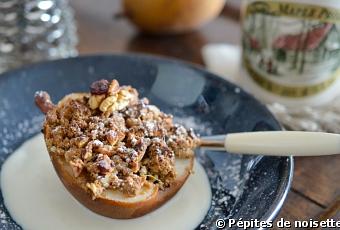 - Coupez les poires en 2, en supprimant les pépins et la membrane. Parsemez généreusement chaque demi poire de pâte à crumble et enfournez 20 à 25 minutes (le crumble doit être doré, les poires fondantes, tout en conservant un peu de résistance).