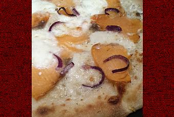 Notre première pizza : saumon fumé, oignon rouge & mozzarella sur une base crème fraiche/aneth