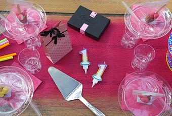 Les détails de ma déco : gobelets à pied 1,89€ les 6, assiettes baroques 1,30€ les 6, cuillères 1€, bougies chiffre 2€, bonbons et pochettes d'anniversaire 1,50€ chaque, serviettes roses 1,30€ le paquet de 20, chemin de table 2,50€ ; le tout Babou.