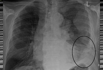 Mésothéliome siégeant dans la zone inférieure du poumon gauche.