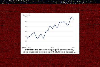 Il est désormais très probable que je ne pourrais plus atteindre les cents journées quand l'hiver touchera à sa fin, mais j'aurai quand même eu la satisfaction de skier plus que mon âge. Combien de temps pourrais-je faire durer ce petit manège ?J'espère bien aller dans mes années 80, mais rien n'est garantit, et au fil du temps, skier mon âge quand je suis nonagénaire me semble de plus en plus incertain, mais je ne baisse pas les bras !