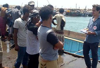 Eric Christopher Wyss, délégué du CICR à Hodeïda, avec les premiers intervenants suite à l’attaque de l’embarcation civile.