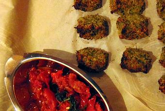Pour faire trempette; des tomates en dés parfumés avec de l'ail, du cari, du paprika fumé, et de la poudre de chili.