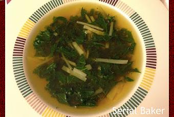 Laver les feuilles de kale, prélever les feuilles et éliminer les tiges. Découper en lanières. Ajouter dans la casserole et laisser cuire 5 minutes.