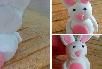 1- Faire deux petites boules avec la pâte à sucre blanche et les aplatir sur la face arrière qui va venir se fixer sur le corps du lapin.
