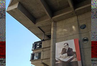 Affiche sur le bâtiment, extraordinaire sur le plan architectural, de la Biblioteca Nacional